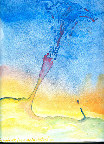 Durante la noche erupciona un volcán en el culo del mundo y el viento nos trae una nube de ceniza que nos cubre mientras dormimos. Cuando me despierto recorro descalza los bultos y los libros. Nuestras cosas desparramadas y sucias parecen el centro de la explosión o, incluso, sus ruinas.